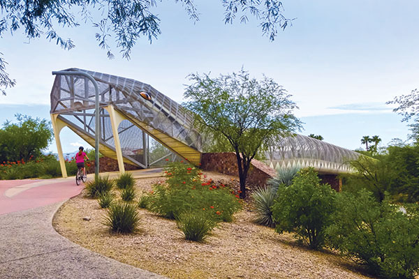 Tucson’s art and music scene reflects our wonderful weirdness, spans every genre, and defies categorization. For a sampling, simply stroll down Congress Street and Fourth Avenue. Tucson’s love affair with itself is on display and beautifully illustrated by the Tucson Portrait Project at the Fourth Avenue underpass. Marvel at the 7,000 individual photo tiles and consider how we combine to create one amazing community. Throughout town, large-scale professional art installations are showcased alongside a myriad of murals and a plethora of personal projects, all contributing to the collective, arty vibe. Walk, skate, or bike through a rattlesnake bridge. Appreciate the small and large-scale mosaics adorning the city of South Tucson. Cruise around town to applaud the homes, yards, and traffic roundabouts flaunting handmade creations. From sculptures and mosaics to Little Free Libraries, giving pantries, free art sidewalk galleries, and business and residential murals, Tucson’s creativity is on display.